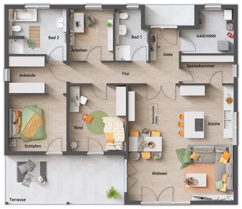 ab Preis1 €Abbildungen enthalten Sonderwünsche die nicht Vertragsbestandteil sind, regionale Preis- und Ausstattungsänderungen möglich. Schlüsselfertig im Sinne dieses Angebotes bedeutet: ohne Tapezier- und Teppichverlegearbeiten.